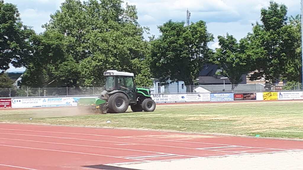 So wurde nun der Rasenplatz nach vielen Jahren wieder einer Regeneration durch eine Fachfirma unterzogen. Der Platz wurde nach der Unkrautbekämpfung in mehreren Schritten mit „schwerem Gerät“ gemäht, vertikutiert, aerifiziert tiefengelockert, gesandet, gedüngt und nachgesät. Danach bedarf das Rasenfeld bei regelmäßiger Bewässerung einer vierwöchigen Ruhephase, damit das Gras entsprechend wachsen kann. Ende Juni dürfte der Rasenplatz dann für VfL und TVE sowie die Schulen wieder vollständig nutzbar sein.